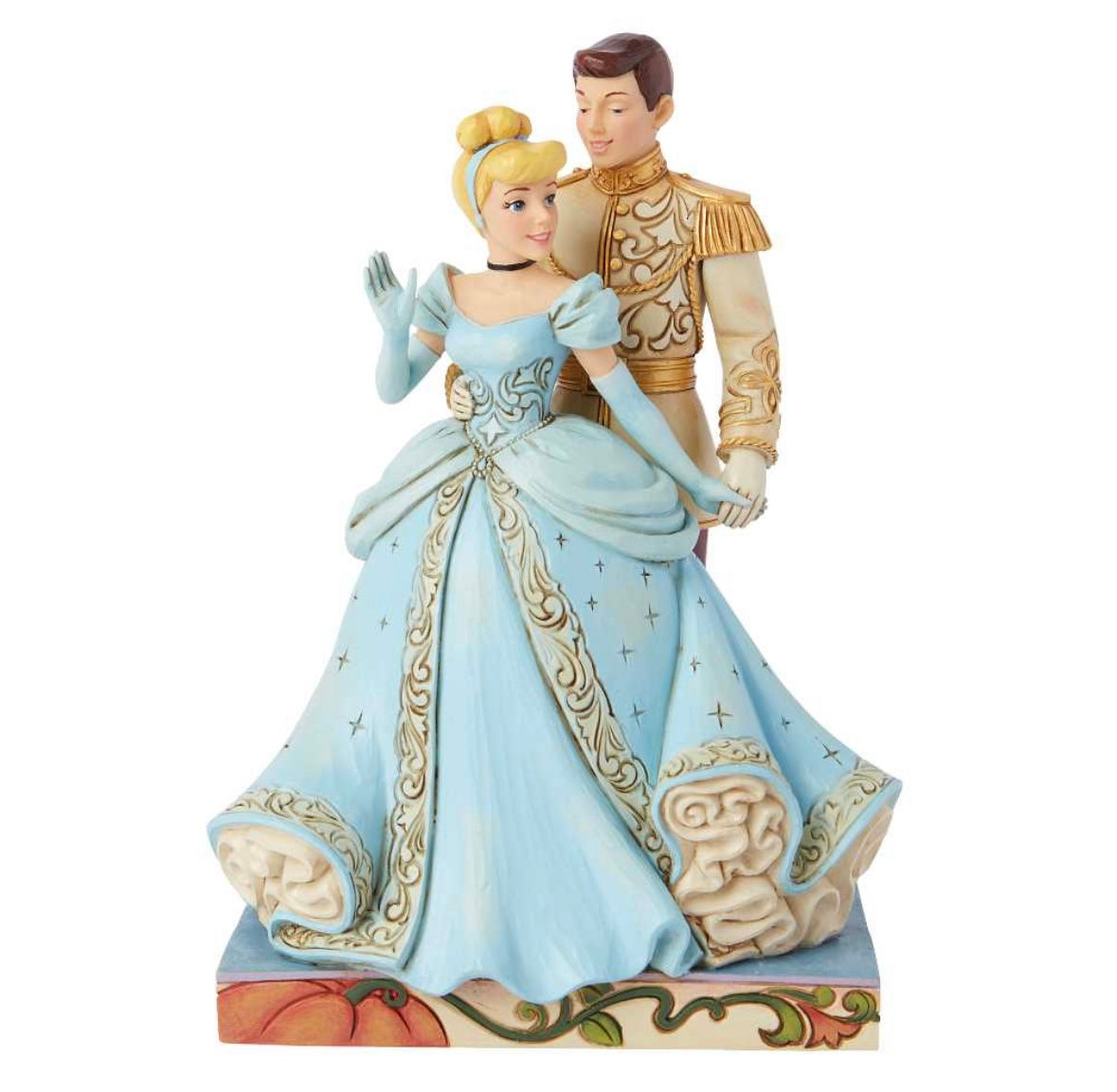 La statua Cenerentola e il Principe di Jim Shore cattura l’incanto del primo ballo tra i due protagonisti del classico Disney. Cenerentola, con il suo splendido abito azzurro ricco di dettagli scolpiti, danza tra le braccia del Principe, elegante nel suo abito da gala. I volti esprimono dolcezza e complicità, mentre le pieghe del vestito e le decorazioni dipinte a mano riflettono la maestria artigianale tipica di Jim Shore. Un pezzo che racchiude romanticismo e magia, perfetto per collezionisti e amanti delle fiabe Disney.