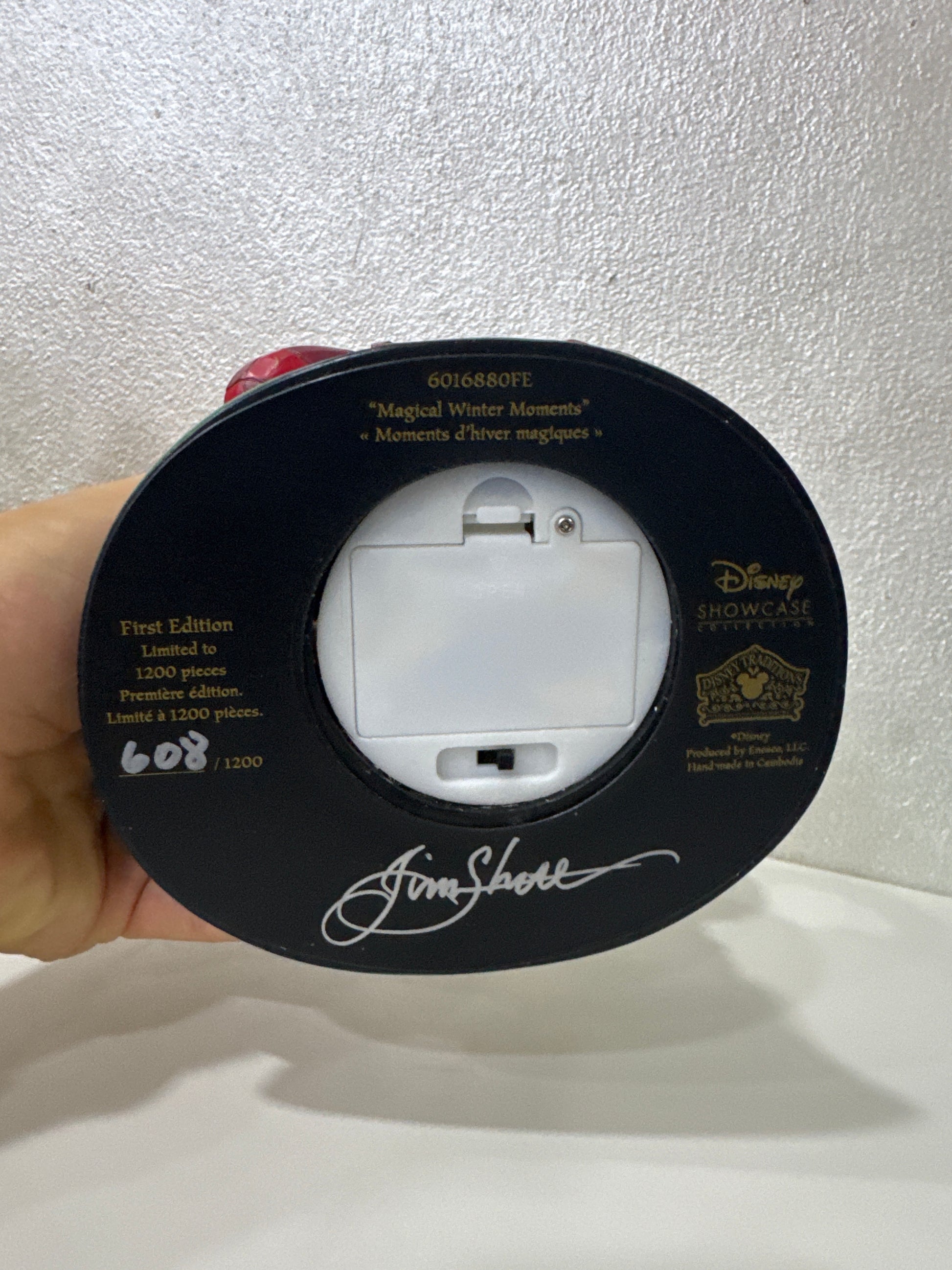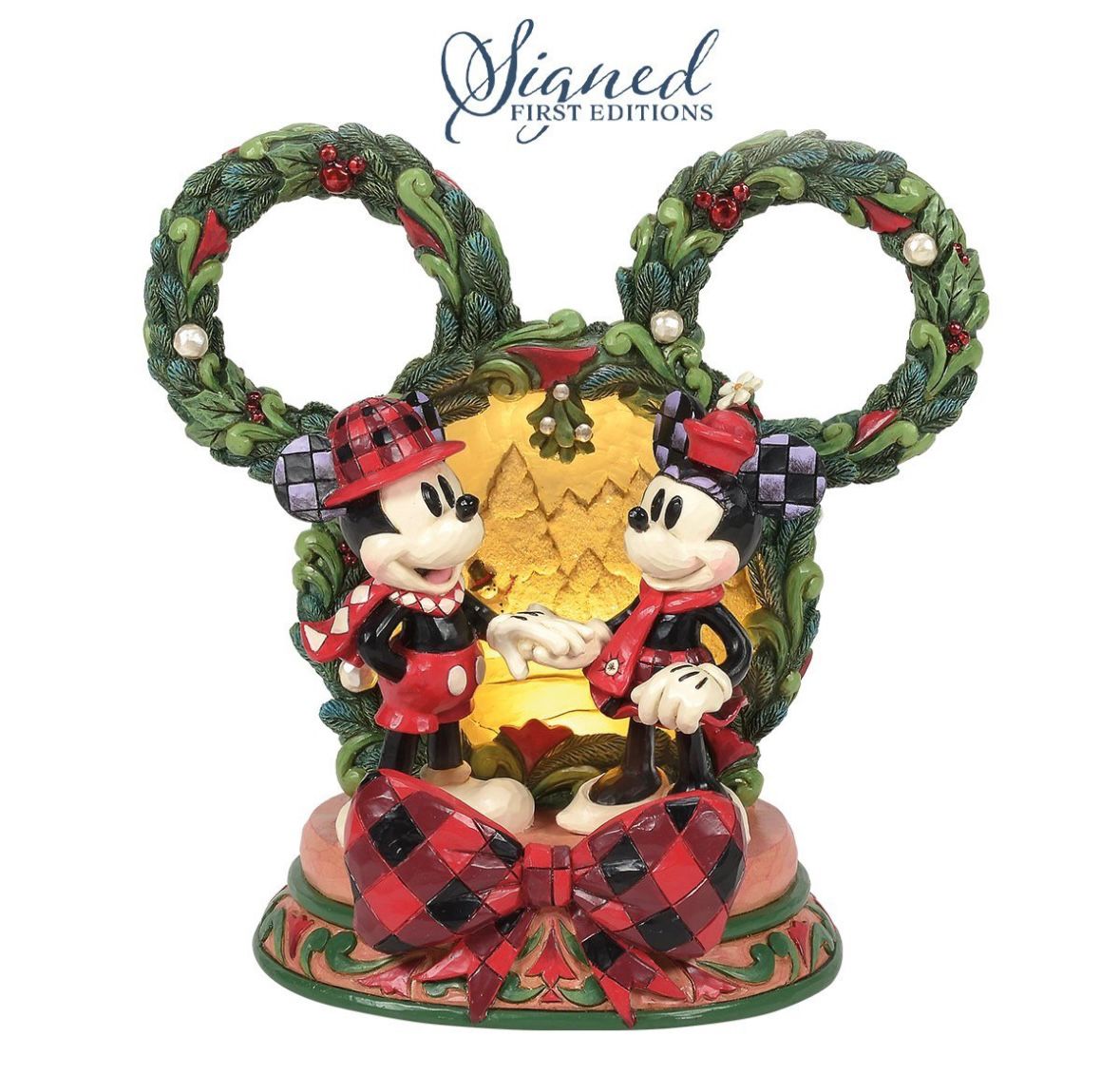 Mickey e Minnie si tengono per mano sotto il vischio, vestiti con i loro outfit scozzesi, tra dettagli scolpiti a mano e colori caldi che profumano di inverno.”